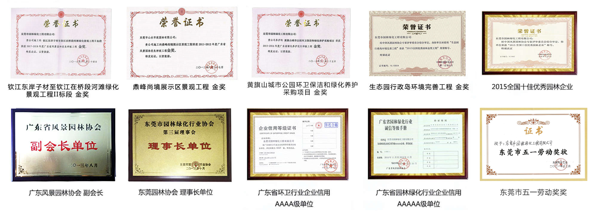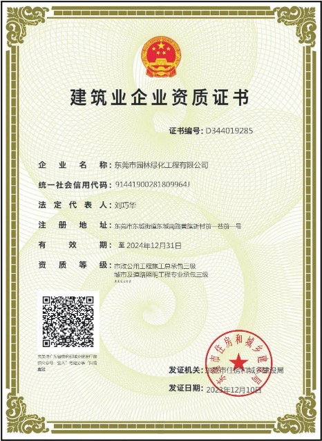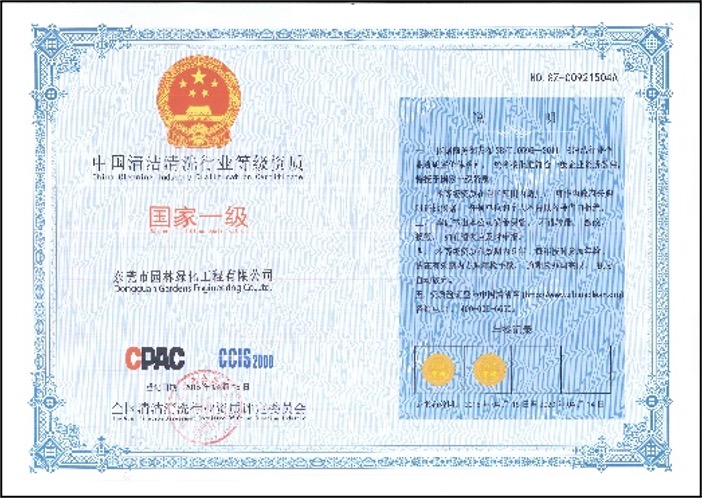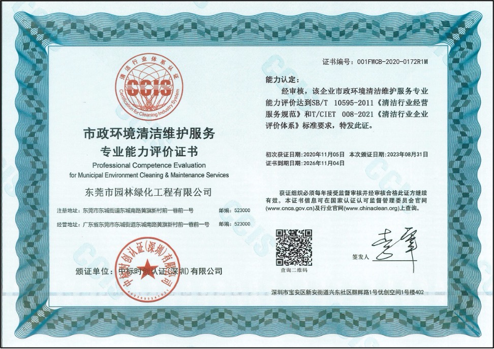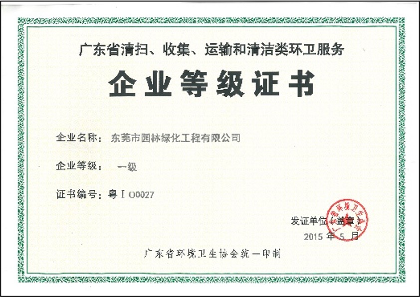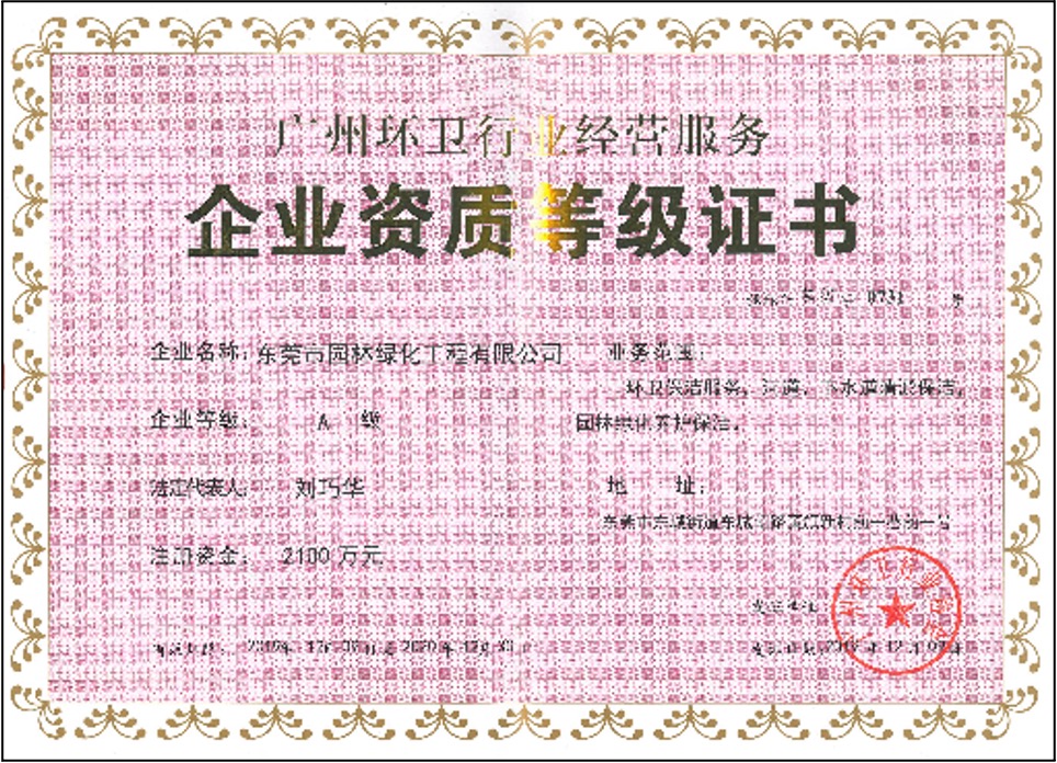 東莞園林擁有市政公用工程施工總承包叁級、中國清洗行業(yè)國家一級、廣東省清掃、收集、運輸和清潔類環(huán)衛(wèi)服務企業(yè)一級等資質;是廣東省風景園林與生態(tài)景觀協(xié)會副會長單位、東莞市園林綠化與生態(tài)景觀行業(yè)協(xié)會理事長單位、中國中小商業(yè)企業(yè)協(xié)會清潔行業(yè)分會常務理事單位、東莞市環(huán)境清潔行業(yè)協(xié)會常務副會長單位、東莞市城市管理科學學會常務副理事長單位、東莞市鄉(xiāng)村振興促進會副理事長單位;榮獲國家高新技術企業(yè)、廣東省重點農(nóng)業(yè)龍頭企業(yè)、全國園林綠化百強企業(yè)、全國清潔(環(huán)衛(wèi))優(yōu)秀企業(yè)、廣東省優(yōu)秀園林企業(yè)等稱號,多個園林綠化項目、環(huán)衛(wèi)項目榮獲“園林工程技術獎”、“優(yōu)良樣板工程獎”,并連續(xù)十五年獲得“守合同重信用企業(yè)”榮譽獎牌。
