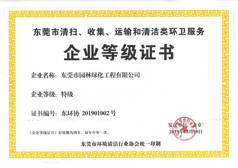 東莞市清掃、收集、運輸和清潔類環(huán)衛(wèi)企業(yè)等級證書(特級)